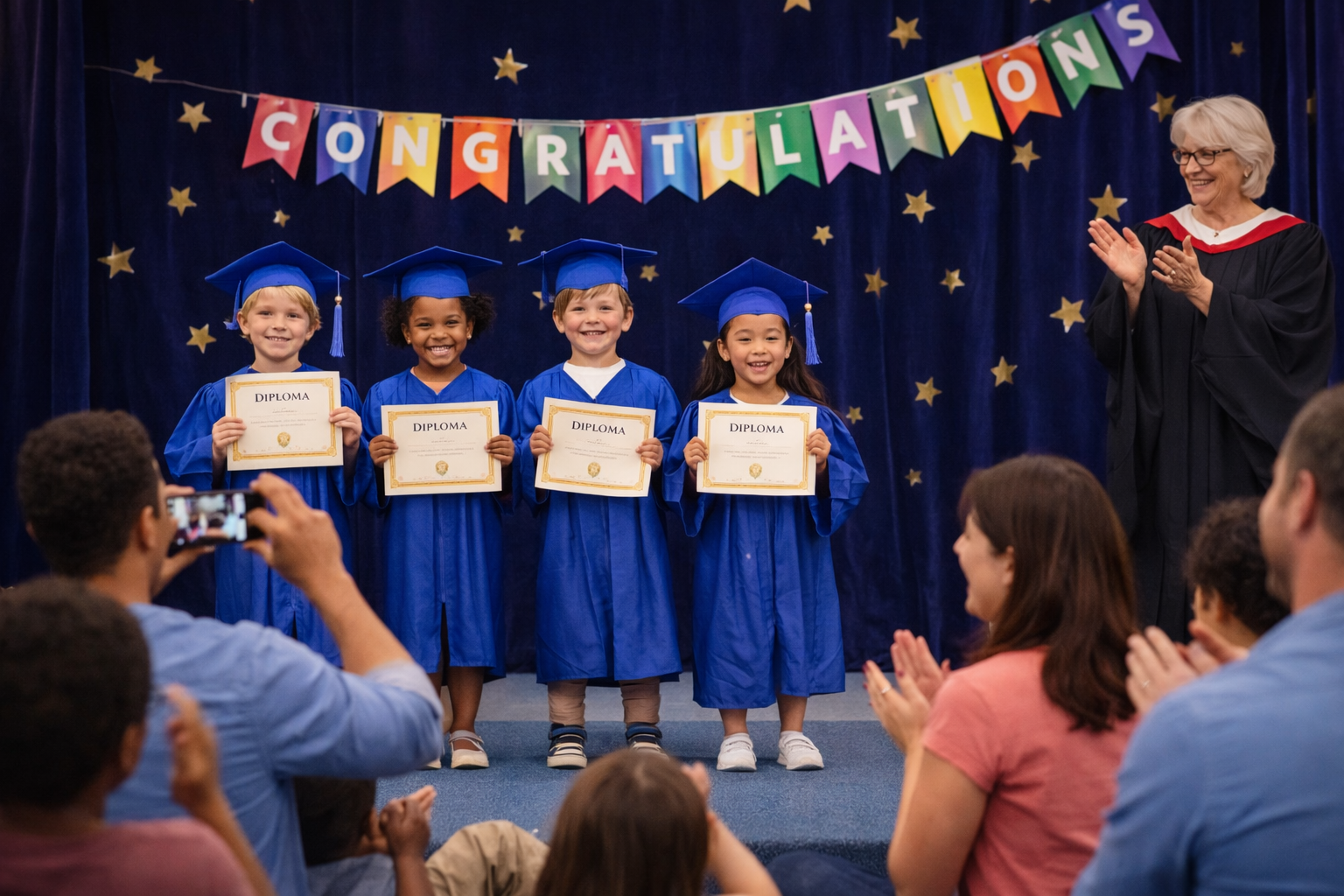 A proud milestone event where children celebrate their achievements with a stage ceremony and special presentations, shared with their families.
